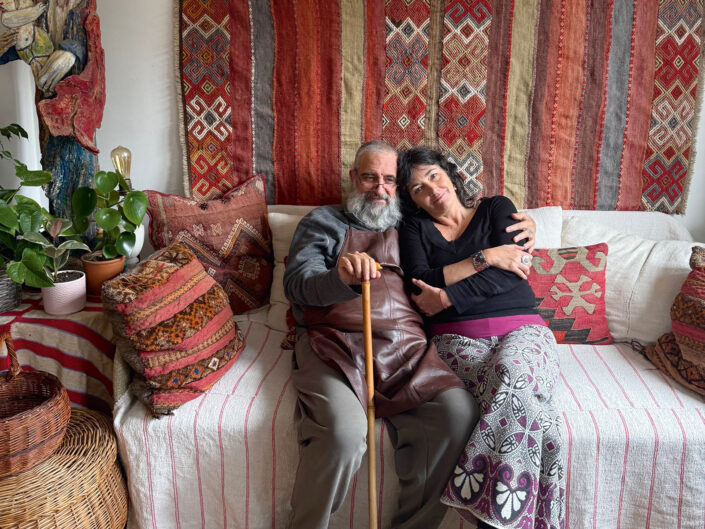 A színkavalkád lenyűgöző. A fotelje egy kikukázott szék, amelyet kilim szőnyeggel húzott át. Ugyanis ha Rózsa épp nem sző, vagy nem tanfolyamokat tart kezdőknek és haladóknak otthon vagy a helyi Szőnyi István Múzeumban, akkor egy budapesti kilimboltban dolgozik hosszú évek óta, nagyszerű tulajok és gyönyörű szőnyegek társaságában.
