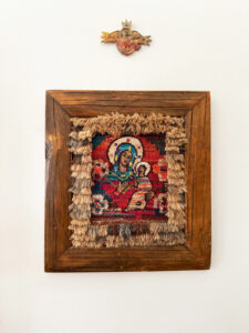Pár perc múlva már egy szőttessel borított asztal mellett melegedünk, a virág már a vázában, rögtön házi szilvás sütemény is kerül, így tele szájjal kérdezhetem Rózsát elsőként a gyönyörű dunai uszadék fából készült Madonnáról a szoba sarkában.