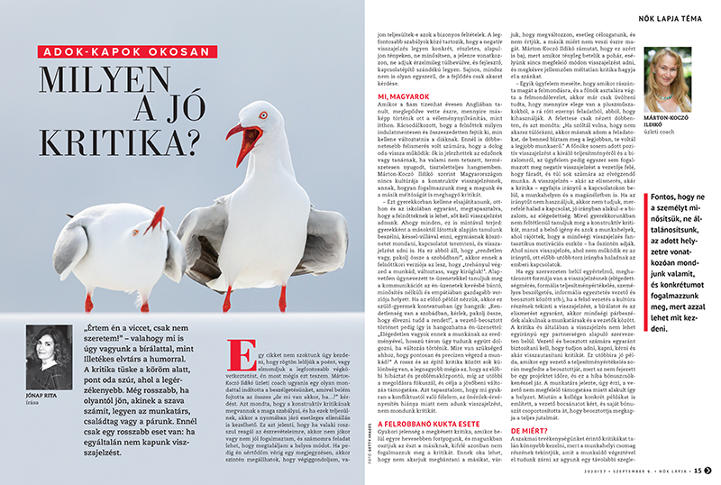 Elbúcsúzom önöktől, ez az utolsó lapszám, amit vezetőszerkesztőként jegyzek. Nagyon fontos volt számomra ez a munka, és életem része marad a Nők Lapja mindörökre. Nem tudok még mérleget vonni az itt töltött időről és a teljesítményemről – de megteszik ezt helyettem majd mások. Az e heti Nők Lapja Téma meg éppen a kritikával foglalkozik, hogy mennyire vagyunk képesek jól adni, illetve jól fogadni. Rendkívül lényeges ez egy ilyen szakmában, mint az újságírói, ahol nagyon könnyű alaposan melléfogni, miközben azt hiszi az ember, hogy élete legviccesebb, leghangulatosabb művét írta meg. Ez pedig számomra azért is nagyon aktuális, mert nemrég kaptam egy levelet, amiben egy olvasó kritikával illet, amiért a gyerekeimmel történteket rendszeresen felhasználom az írásaimban. Az olvasó azt írta, hogy nemcsak a gyerekkori fényképek mérlegelés nélküli felpakolása az internetre sértheti a gyerekek személyiségi jogait, hanem az is, ha a szüleik megírják a velük történt eseteket. Ha tényleg a gyerekeim legjobb érdeke lebegne a szemem előtt, akkor ezt abbahagynám. Elgondolkodtam. Ki tudja, talán igaza van a bírálómnak, és tényleg nem kellene zsengébb korú családtagjaim ügyes-bajos dolgait ország-világ elé tárnom, pláne nem némileg stilizált formában, hogy még szórakoztatóbb legyen. Nem mentegetőzésképpen mondom, de egyből eszembe jutott, hogy mennyi, de mennyi írással foglalkozó ember merített ihletet a családjából, mint például A. A. Milne a Micimackóhoz vagy Gerald Durrell, akinek az egész életműve tulajdonképpen másról sem szól, mint a családtagjai viselt dolgairól. Nem szeretném magamat ezekhez a nagyságokhoz hasonlítani, csak meg akartam mutatni, hogy minden írással foglalkozó ember arról szeret írni, amit jól ismer, és nem keveseknek ez éppen a családja. (Szent meggyőződésem, hogy a való élet sokkal kacifántosabb történeteket képes produkálni, mint bármilyen élénk fantázia.) Ahhoz kell aztán az írói szem, hogy az alaktalan eseményfolyamban a történetet észrevegye és sikeresen kihámozza. De ez továbbra is az író szempontja, és mi van, ha az, akiről az írások szólnak, valóban nem örül ennek? Gondoltam, megkérdezem erről az érintetteket, legelőször a már felnőtt fiaimat. Ők azt felelték, nem bánják, hogy írtam róluk, sőt örülnek neki, mert azok a történetek nem tűntek el a feledés süllyesztőjében, amelyek így rögzítésre kerültek. Ezután megkérdeztem a hétéves Bernit, akiről az utóbbi időben a legtöbbet írtam.