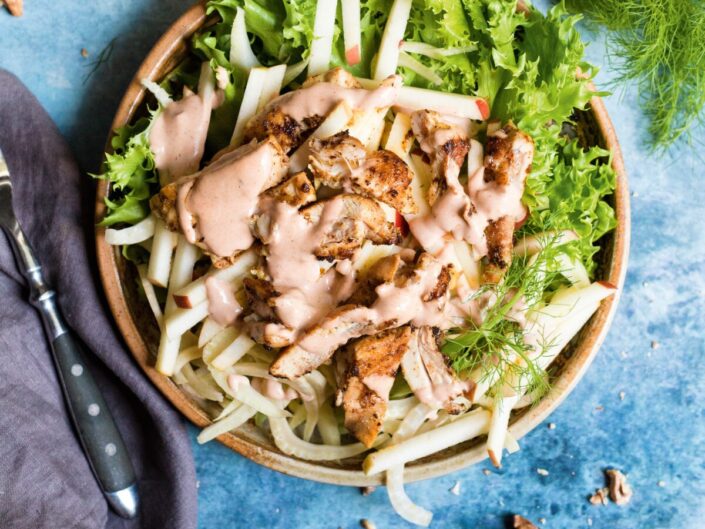 Az édesköményes, almás, diós saláta sült csirkecombbal receptje