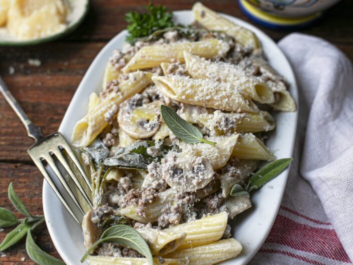 Penne gombás-zsályás-tejszínes marharaguval