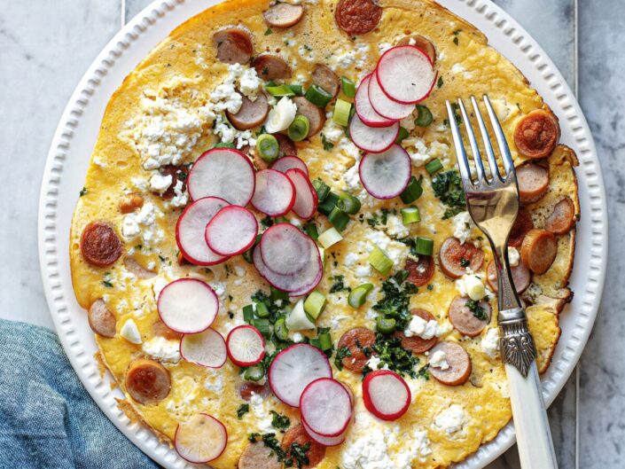 Színes, friss és laktató – ez a tavaszi omlett a szezon legjavát hozza el a tányérjára. A pirított virsli és a szemcsés túró tartalmassá teszi, miközben az újhagyma és a retek roppanós lendületet ad az ételnek.