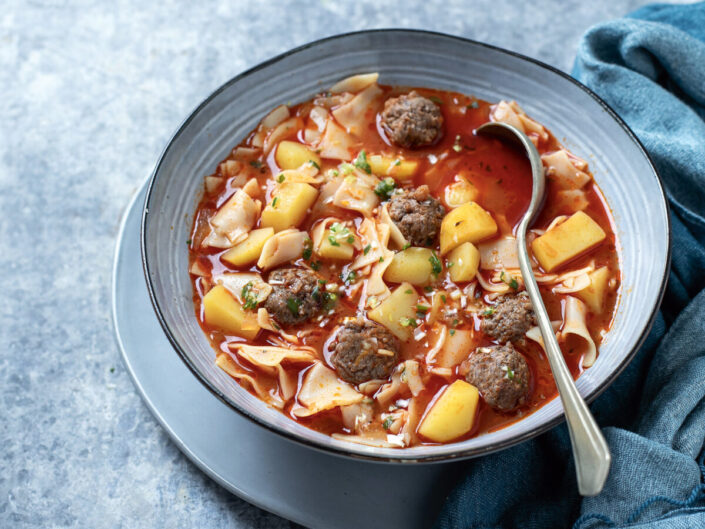 Tartalmas, házias leves, ahol a fűszeres húsgombóc és a lebbencstészta együtt fő puhára. Laktató egytálétel, amely igazi komforthangulatot teremt.