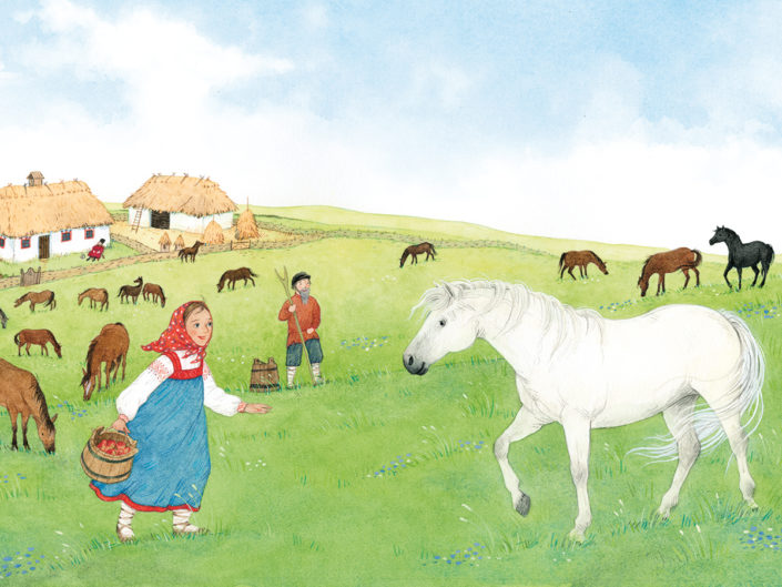 lóval a füves pusztán. A legtöbb ló a nagybátyjáé volt, csupán egy fehér, hosszú sörényű kanca volt az apukájáé. Kátya imádta! Mindennap gondosan fényesre kefélte a szőrét, aztán piros almát vagy ropogós sárgarépát adott neki enni.
