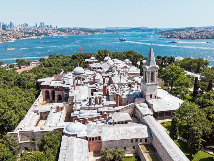 A komplexum az Hagia Szophia és a Kék mecset közelében épült: történelmi helyszín ez, ahol egykor az udvari szolgák nagy üstökben főzték az ételt, a követek lovon érkeztek, a hívők a mecsetekbe siettek imádkozni. Magas, átláthatatlan, bástyákkal megerősített fal védi a Topkapi – magyarul Ágyúkapu – névre keresztelt palotát, amelynek építését a 15. század közepén fejezték be, és évszázadokig a szultánok és családjaik, a nagyvezír, janicsárok és szolgák lakhelyéül szolgált. Helyet adott a háremnek is, melyről máig sok legenda kering. 1853-ig tartott a fényűző élet, amikor a szultán, I. Abdul-Medzsid teljes udvartartásával az újonnan épült Dolmabahçe-palotába költözött.